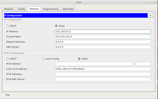1. Klik 2x pada pc 1 > ip configuration > isikan ip addess 192.168.20.1 netmask 255.255.55.0